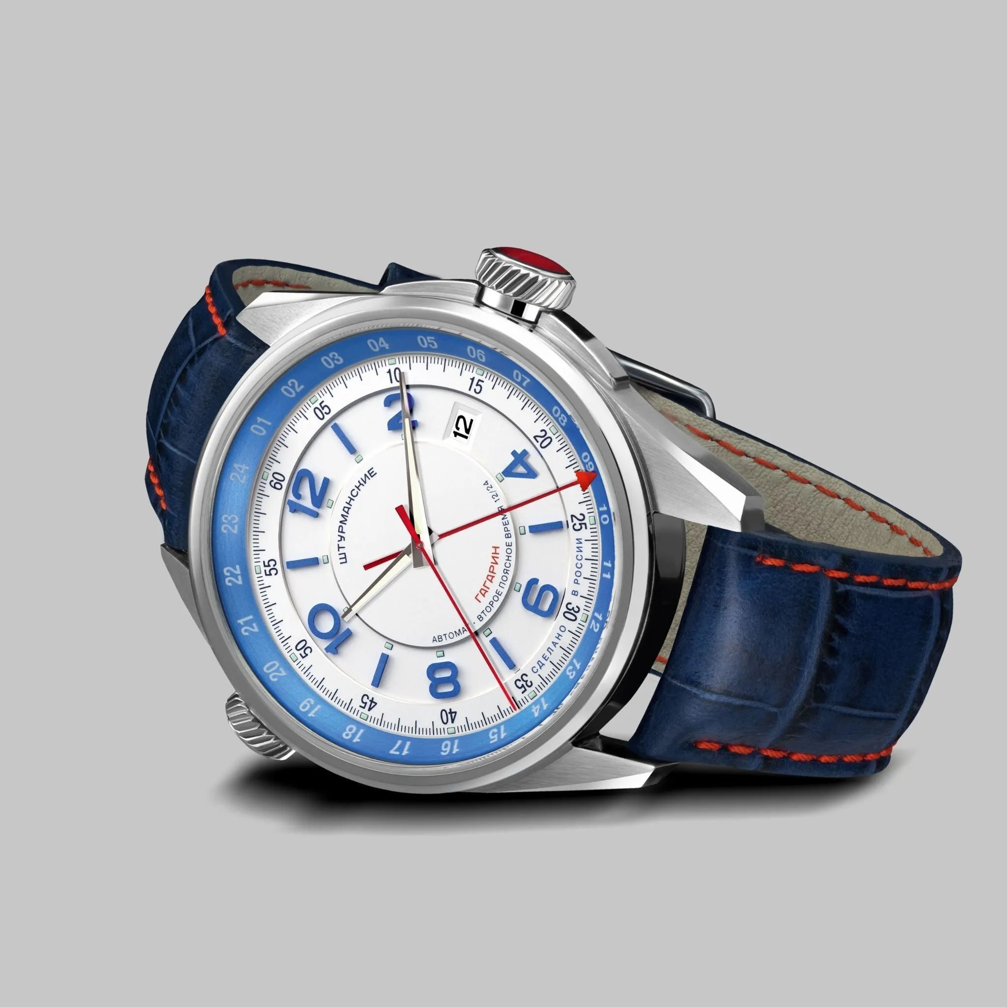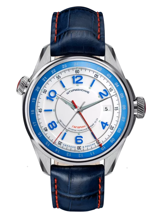 ГАГАРИН 24 Часа– коллекция практичных часов со стильным дизайном. В них идеально сочетаются богатые советские традиции часового ремесла и реалии сегодняшнего дня – проверенный временем механизм Восток 2426 дополнен модным корпусом с множеством полезных функций.Эти часы идеально подходят для тех, кто хочет поспевать за бешеным ритмом современной жизни. Бело-голубой циферблат с люминесцентными индексами порадует высокой информативностью – на нем есть две временные шкалы (12- и 24-часовая), второй часовой пояс, окошко для отображения текущей даты. Широкий темно-синий ремешок с красной строчкой отлично сочетается с довольно крупным корпусом (44 мм) из полированной матированной стали. В часах использован оригинальный советский механизм с автоматическим подзаводом и запасом хода 31 час.
