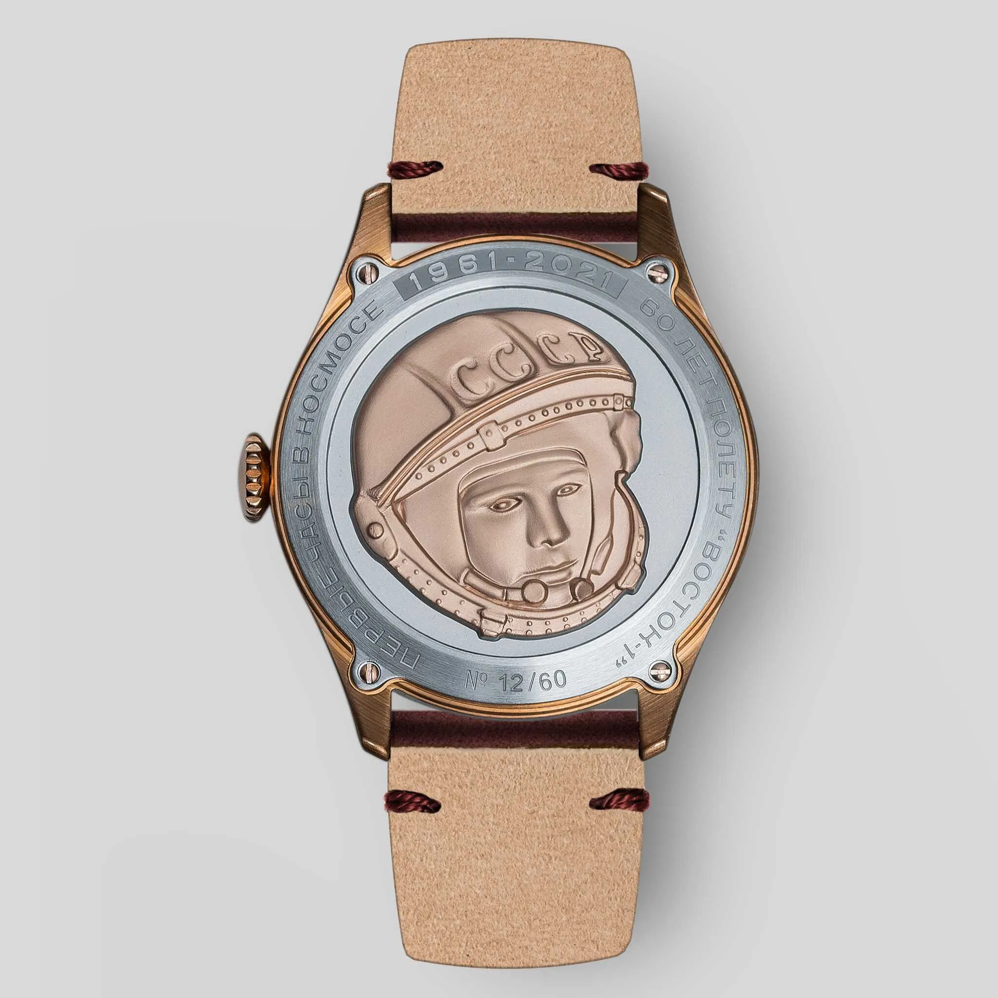 12 апреля 1961 года для человечества началась новая эра. Вдохновленные отвагой и смелостью первооткрывателя космоса, мы разработали юбилейную модель часов Гагарин 60 лет, которую постарались сделать безупречной во всех отношениях.Эта модель отличается ярким дизайном. Кожаный ремешок идеально подходит к бронзовому корпусу и лаконичному светло-серому циферблату выполненому из серебра 925 пробы. Узнать время не составит труда и в темноте – стрелки и метки наполнены люминесцентным составом. Заводная головка конической формы с удобной насечкой повторяет дизайн оригинальной модели.Сзади на крышке помещен барельеф с изображением Юрия Гагарина с уникальной юбилейной гравировкой «60 лет полету ВОСТОК-1» и порядковым номером серии. Лимитированная партия, 60 штук по всему миру. Часы оснащены оригинальным противоударным механизмом Полет 2609 с автоматическим заводом и запасом хода 38 часов.