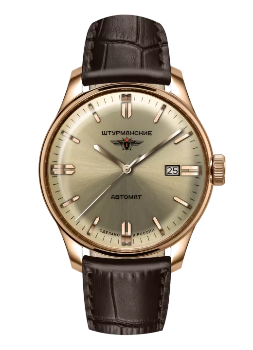 Простая вещь в руках гения становится необыкновенной. Лаконичные Штурманские часы Юрия Гагарина после его легендарного полета стали мечтой миллионов. Сегодня мы воплощаем ее в жизнь с коллекцией Гагарин Классика Автомат.Выразительная модель с коричневым кожаным ремешком и позолоченным корпусом. Лучеванный циферблат переливается по-разному в зависимости от угла наклона. Его украшают тонкие индексы-штрихи и лаконичные стрелки с люминесцентным покрытием. Около колесика наклона расположено миниатюрное окошко для отображения текущей даты. Циферблат закрыт минеральным стеклом сферической формы, которое надежно защищает его от повреждений и в то же время придает часам дополнительные объем. Внутри влагостойкого стального корпуса без устали трудится премиальный механический калибр Miyota 9015 с автоподзаводом и запасом хода 42 часа.