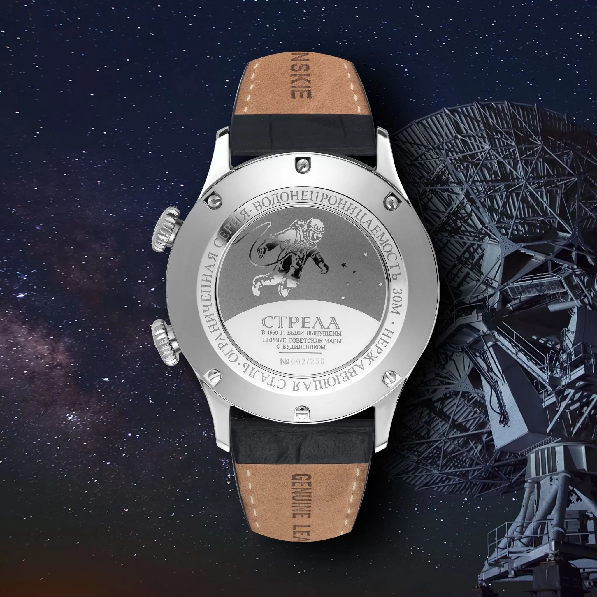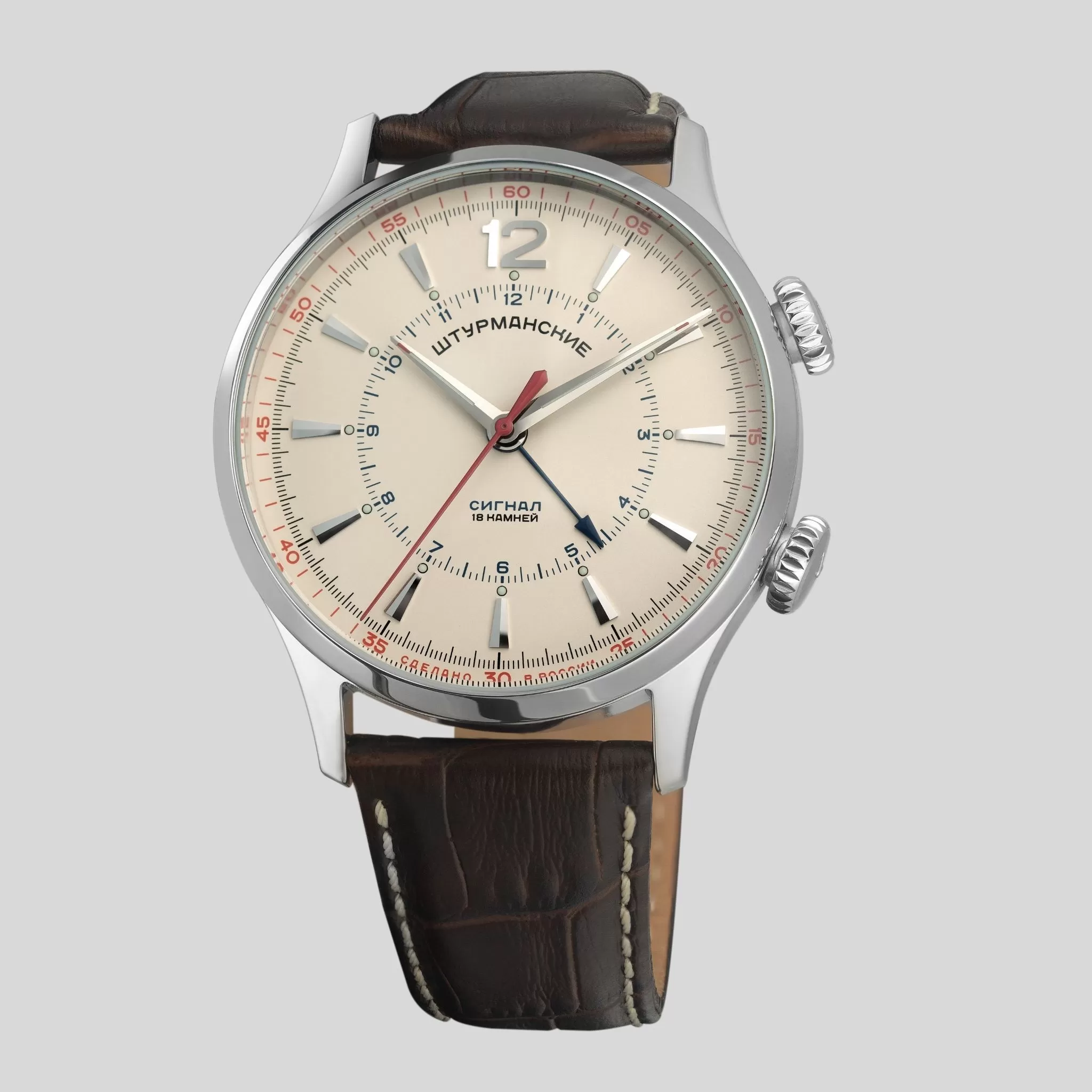 Открытый Космос Сигнал – линейка Штурманских, созданная на базе уникального советского механизма Полет 2612 с функцией сигнала. Он выпускается и успешно используется на отечественных часах с 1959 года. Коллекция лимитированная, поэтому уже сейчас считается коллекционной редкостью. Не отказывайте себе в удовольствии стать обладателем легенды.Эти часы – настоящее воплощение советской классики. Лаконичный дизайн подчеркивается сдержанной цветовой гаммой – белый циферблат идеально сочетается с темно-коричневым кожаным ремешком и полированным стальным корпусом. Метки и стрелки на крупном циферблате люминесцентные, отлично читаются даже в полной темноте. Часы имеют запас хода 31 час.