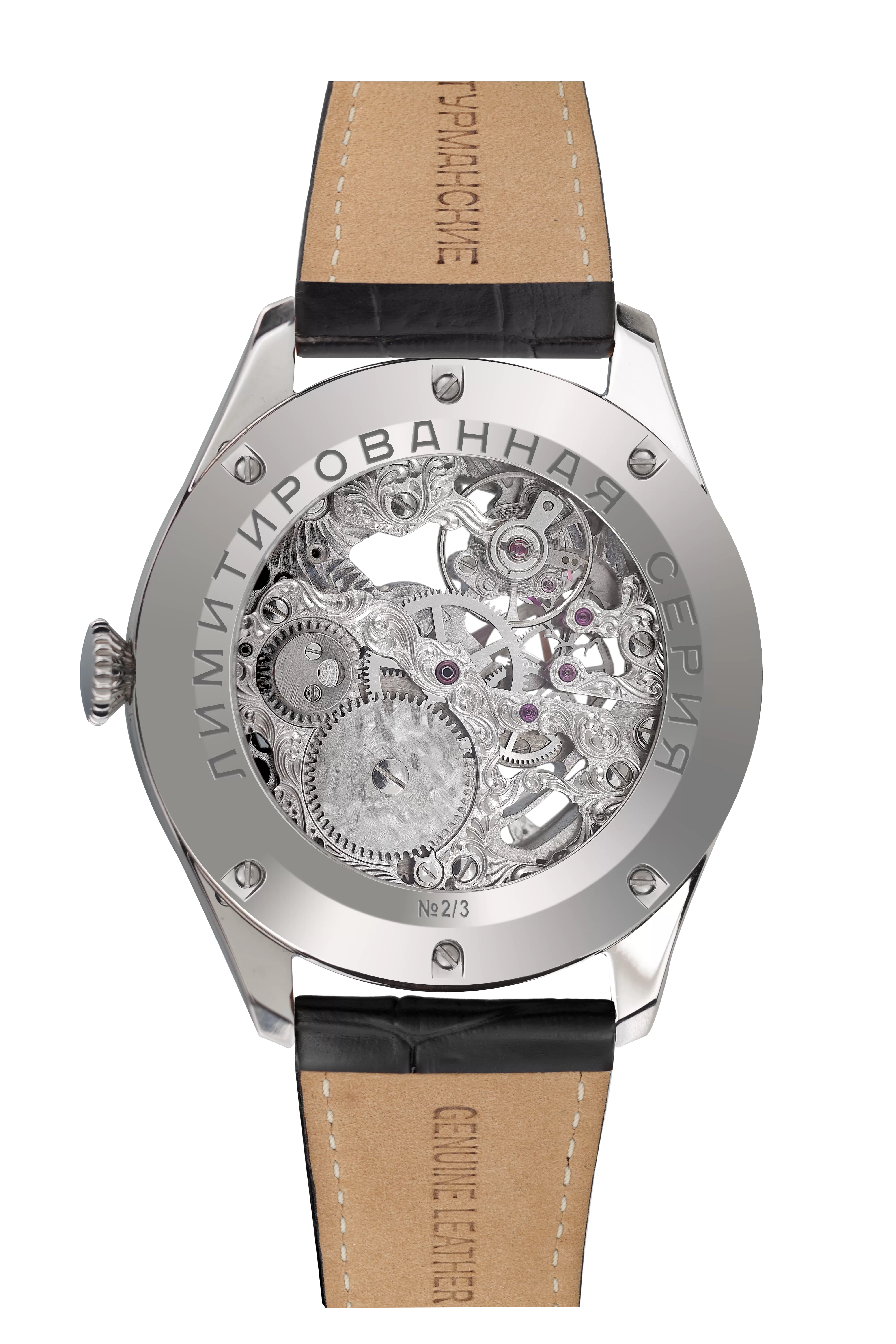 Элегантные часы-скелетон на механизме «Полет 3105» — сочетание традиций российского часового мастерства и современного дизайна. Открытый циферблат демонстрирует работу механизма, позволяя наблюдать за каждым движением шестерёнок.Каждая модель изготавливается вручную, что делает каждый экземпляр уникальным и подчёркивает внимание к деталям.