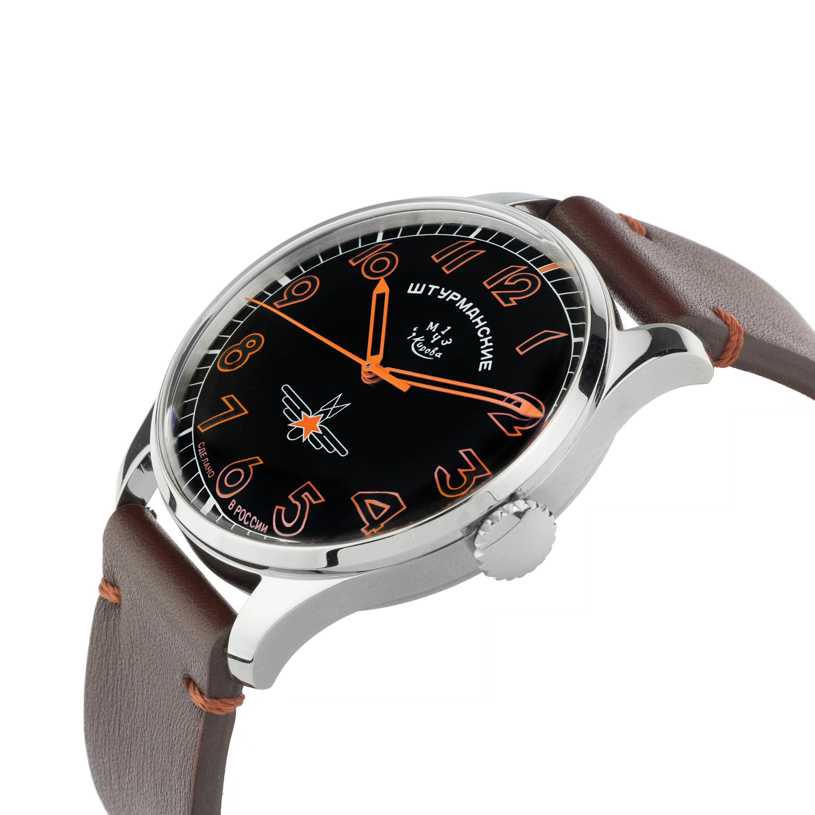Штурманские часы по праву носят звание космических, ведь именно они сопровождали Юрия Гагарина в первом полете на земную орбиту. Коллекция Гагарин Наследие Автомат 40 бережно переносит классический дизайн легенды в наши дни.Эта модель отличается простым, но невероятно притягательным мужским дизайном. Круглый корпус из нержавеющей стали идеально сочетается по цвету с лаконичным ремешком из коричневой кожи и стандартной пряжкой. На циферблате черного цвета ретро-шрифтом нанесены крупные индексы 12-часовой шкалы. Стекло на циферблате выпуклое, с двумя радиусами. В качестве механизма для этой модели использован отечественный Полет 2416 с автоматическим заводом, который видно через прозрачную крышку.