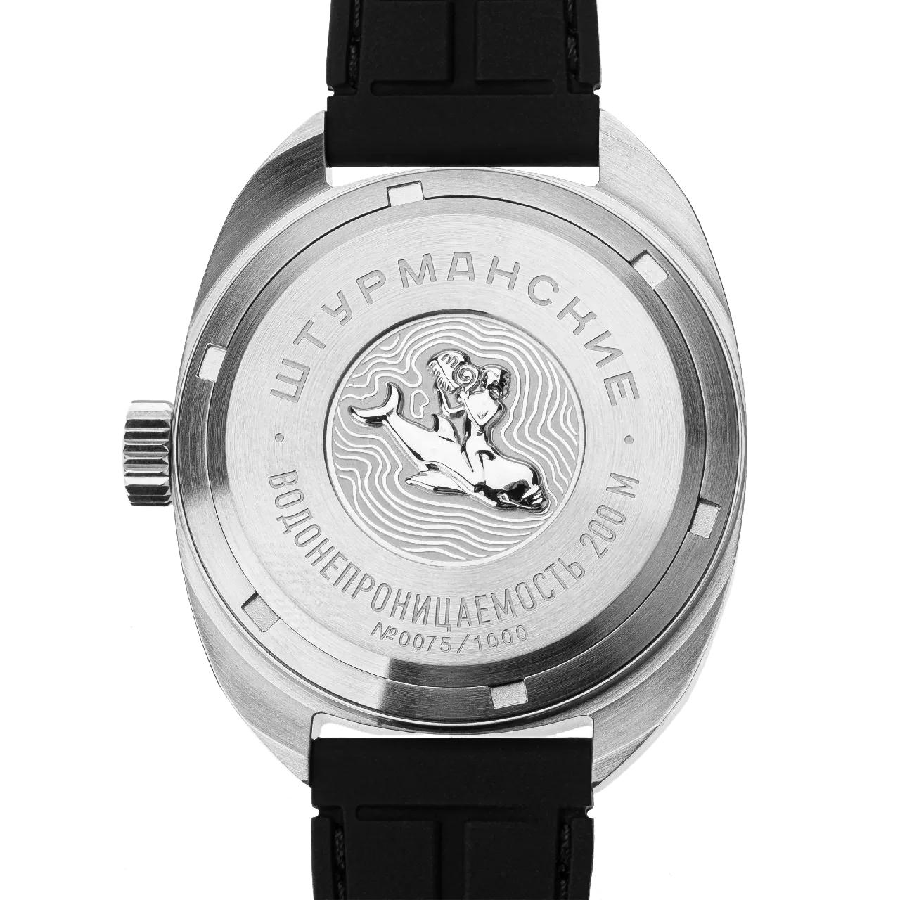 подзаводом, 2416. Корпус, изготовленный из нержавеющей стали, имеет водонепроницаемость 20 атмосфер, обеспеченную утолщённым сферическим стеклом, завинчивающуюся заднюю крышку и заводную головку. Чёрный вращающийся ободок – классическое решение для дайверских часов – помечен контрастной люминесцентной шкалой и оцифровкой чётких геометрических линиях. На задней крышке – как дань исторической модели – рельефные изображения всадника на дельфине.