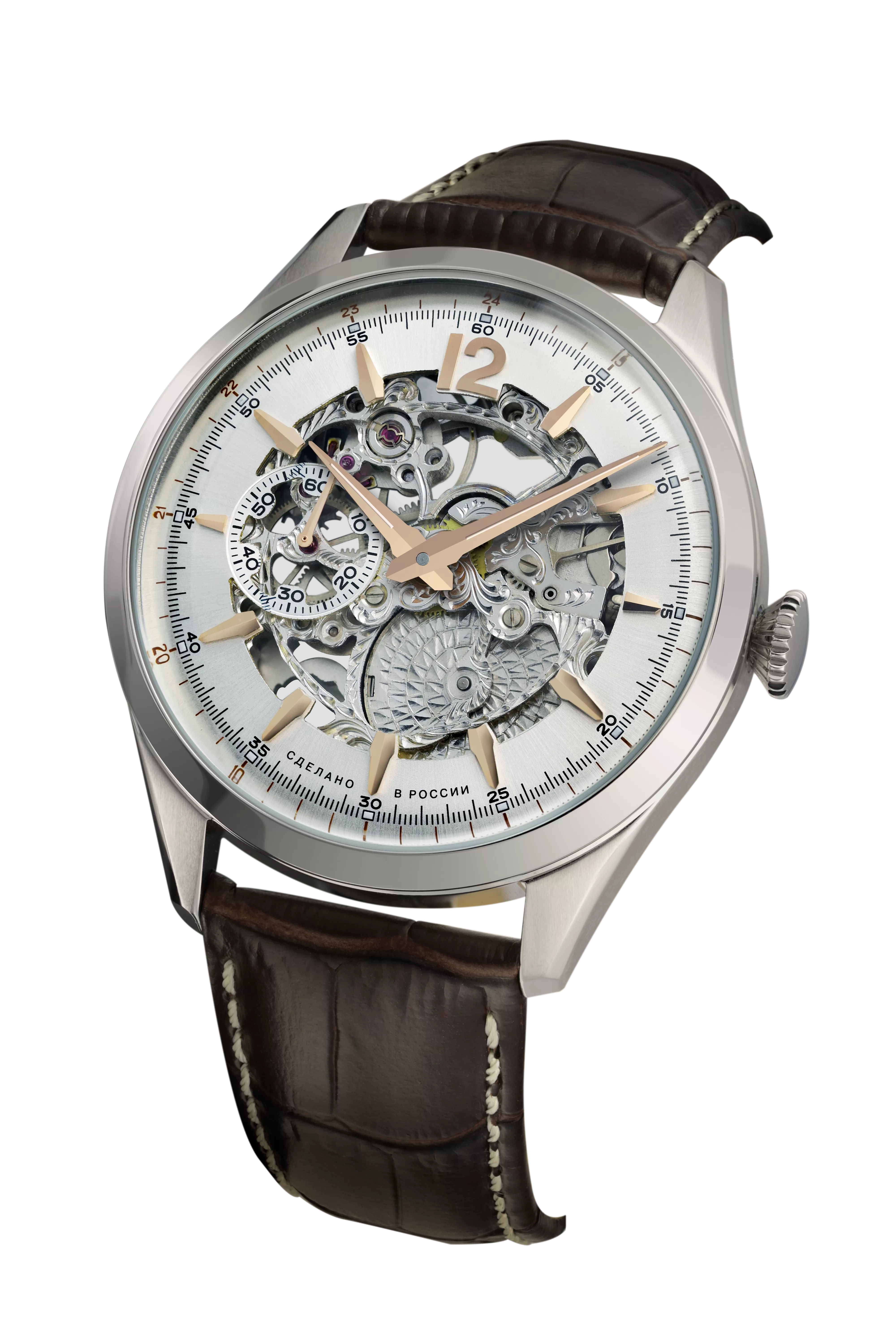 Элегантные часы-скелетон на механизме «Полет 3105» — сочетание традиций российского часового мастерства и современного дизайна. Открытый циферблат демонстрирует работу механизма, позволяя наблюдать за каждым движением шестерёнок.Каждая модель изготавливается вручную, что делает каждый экземпляр уникальным и подчёркивает внимание к деталям.