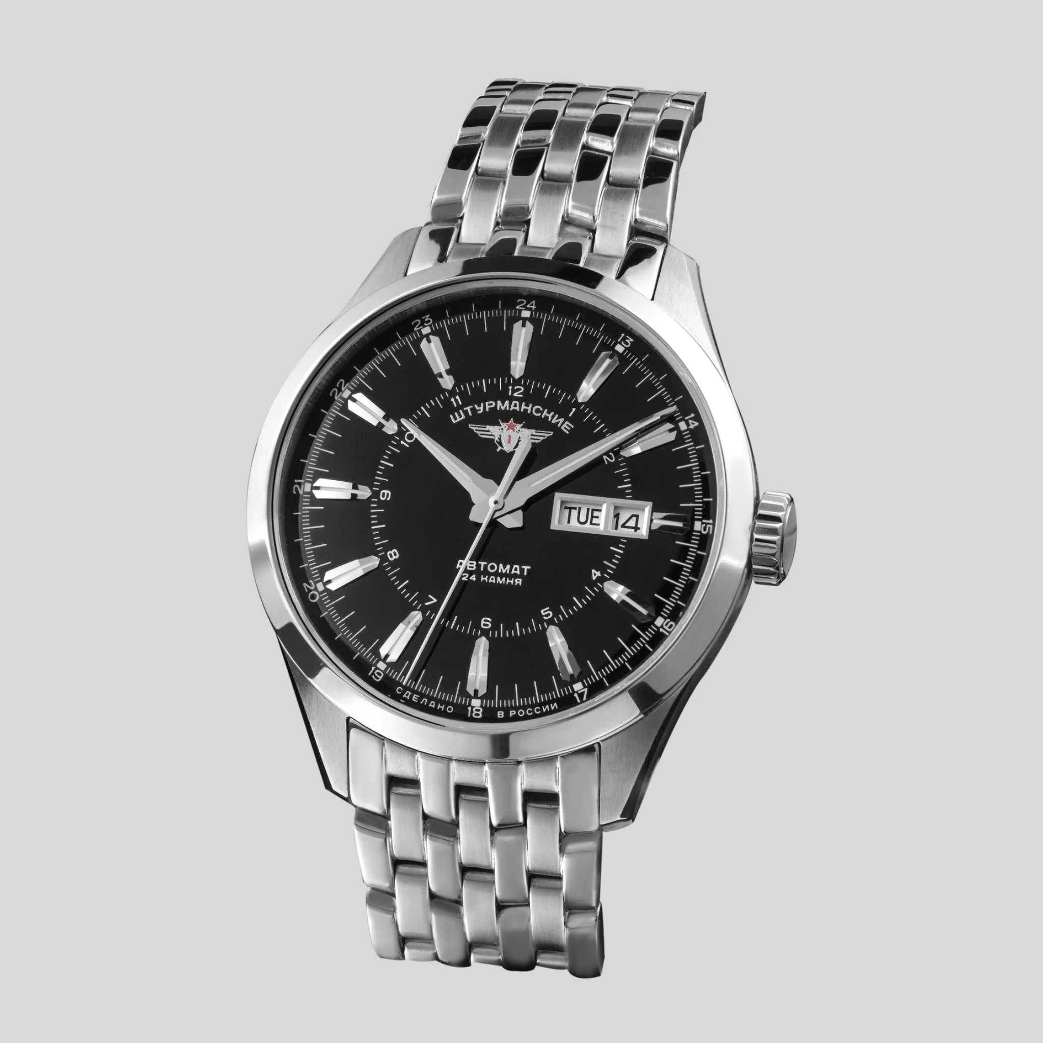 Линейка Открытый Космос Day-Date Автомат – это новое прочтение часовой классики. Коллекцию отличают современный дизайн со сложными линиями и формами, функциональный циферблат с отображением времени, даты и дня недели, надежный механический калибр Seiko NH36 с автоматическим подзаводом.Функциональная модель мужских часов в классическом исполнении. Отличается стильной черно-серебристой цветовой гаммой. Метки на циферблате накладные, выполнены в форме штрихов сложной формы. Помимо времени часы показывают также текущую дату и день недели. Стальной браслет с раскрывающейся застежкой отлично сочетается с черным циферблатом. Стальной корпус характеризуется повышенной прочностью и надежностью. На задней крышке размещен барельеф с изображением космонавта в открытом космосе.