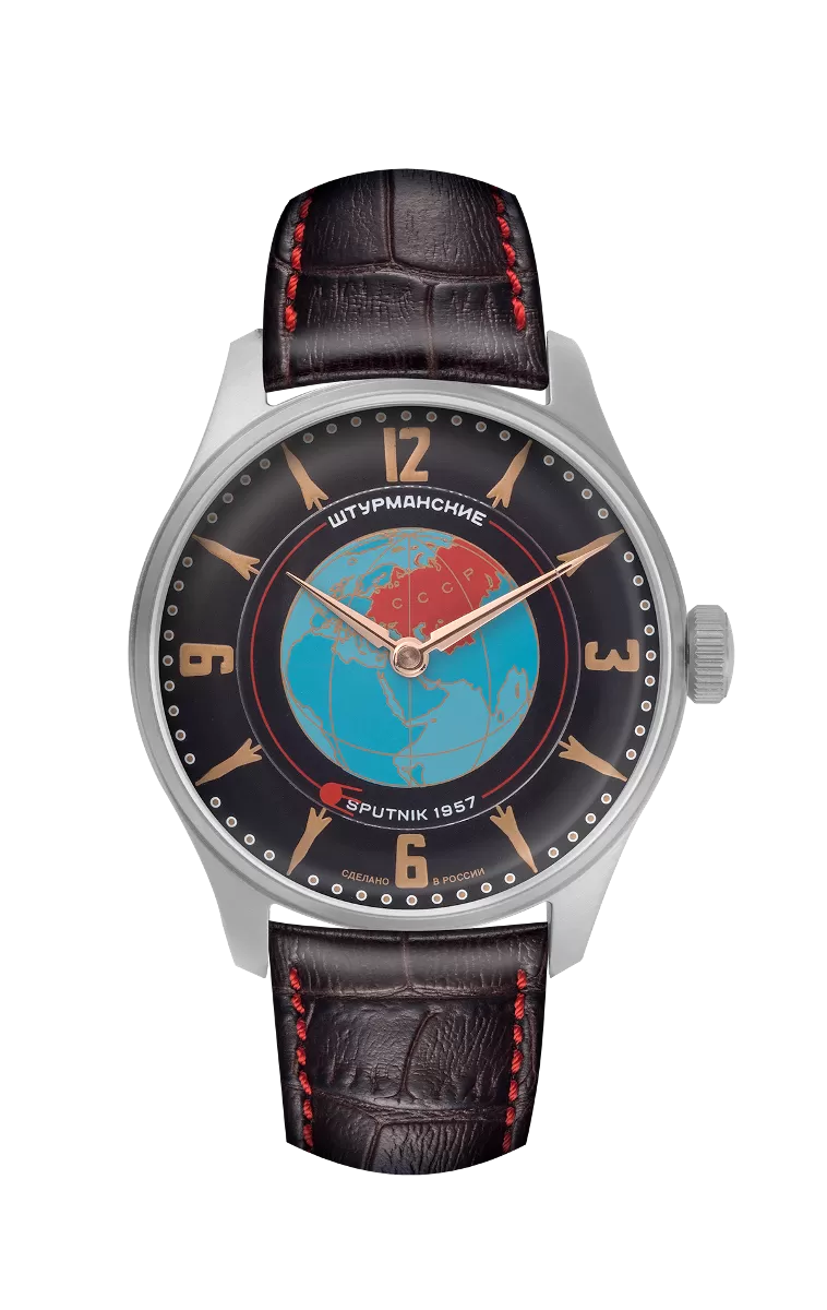 Запуск на орбиту Земли первого искусственного спутника стал настоящим прорывом в освоении космоса. Штурманские увековечили это революционное событие в специальной коллекции. Часы Спутник Наследие выводят понятия красоты, надежности и функциональности на новый, ранее недостижимый уровень.Классика с яркими деталями – так можно охарактеризовать эту выразительную модель мужских часов. Тон дизайну стильного аксессуара задают сочетание темно-коричневого, стального и красного цветов, оригинальный рисунок земного шара и секундный указатель в виде красного спутника на орбите. Люминесцентные индексы светятся в темноте. Циферблат защищен от повреждений минеральным стеклом, которое не царапается и не стирается. Часы оснащены надежным отечественным механизмом Полет 2609 с ручным заводом на 42 часа и защитой от ударов. Корпус отличается средней степенью водостойкости (5 ATM).